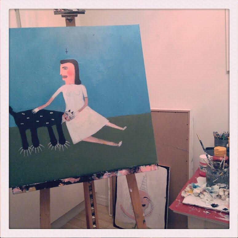 After 24 hours of this routine of frustration and layers and layers of paint, I decided to kill it. And when I did, this thing was born instead. It is me with the observation cat from my recurring nightmare. I have such a clear vision of it – I just have to follow it without doubting it. I feel completely exhausted but so, so good. I will leave the studio now. My beautiful battlefield of destruction and magic.