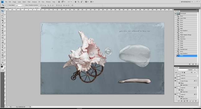I am finally back to making art again. It’s been 5 months since I finished the last piece in PhotoShop (The Blue Connection). Being creative is my natural state, so I am starting to feel like myself again. I can see that my style has changed a bit since the last 2 pieces. It has shifted from a darker expression to a more delicate and dreamy style. My collage technique has always been driven by a freudian selection of images – but I work on a much deeper level now. My new collection of works will be my most personal one yet. Like visual diary notes. Who needs therapy when you have a talent to dig into yourself and bring it out as an emotional confession through a clear visual expression?