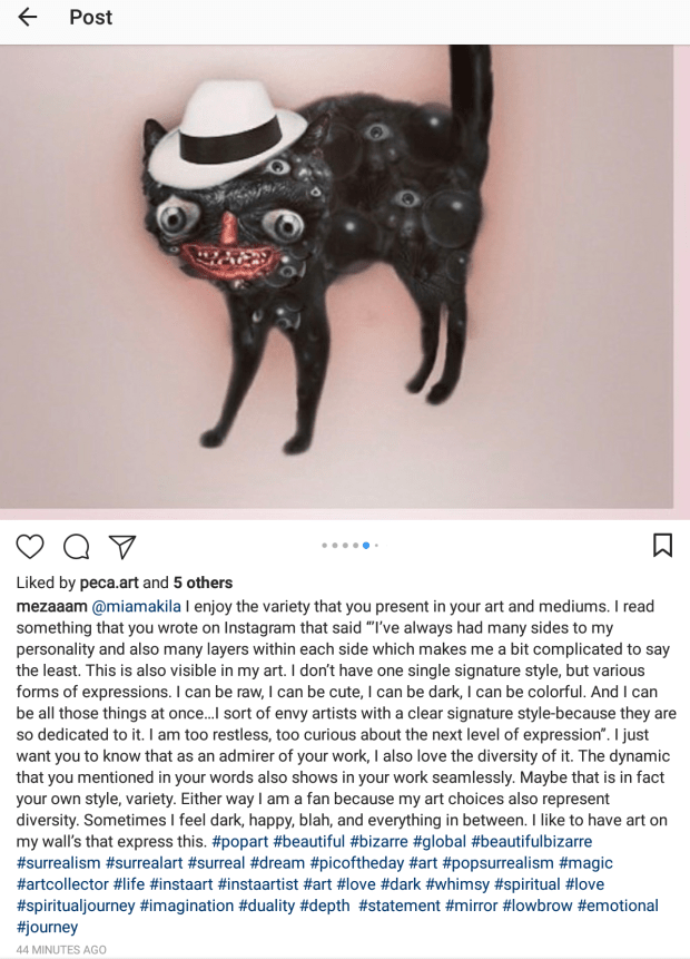 I try not to compare my style with other artists, I am self-taught and I have my own personal mythology so it feels strange for me to look for artists who are like me because it is such a personal thing.