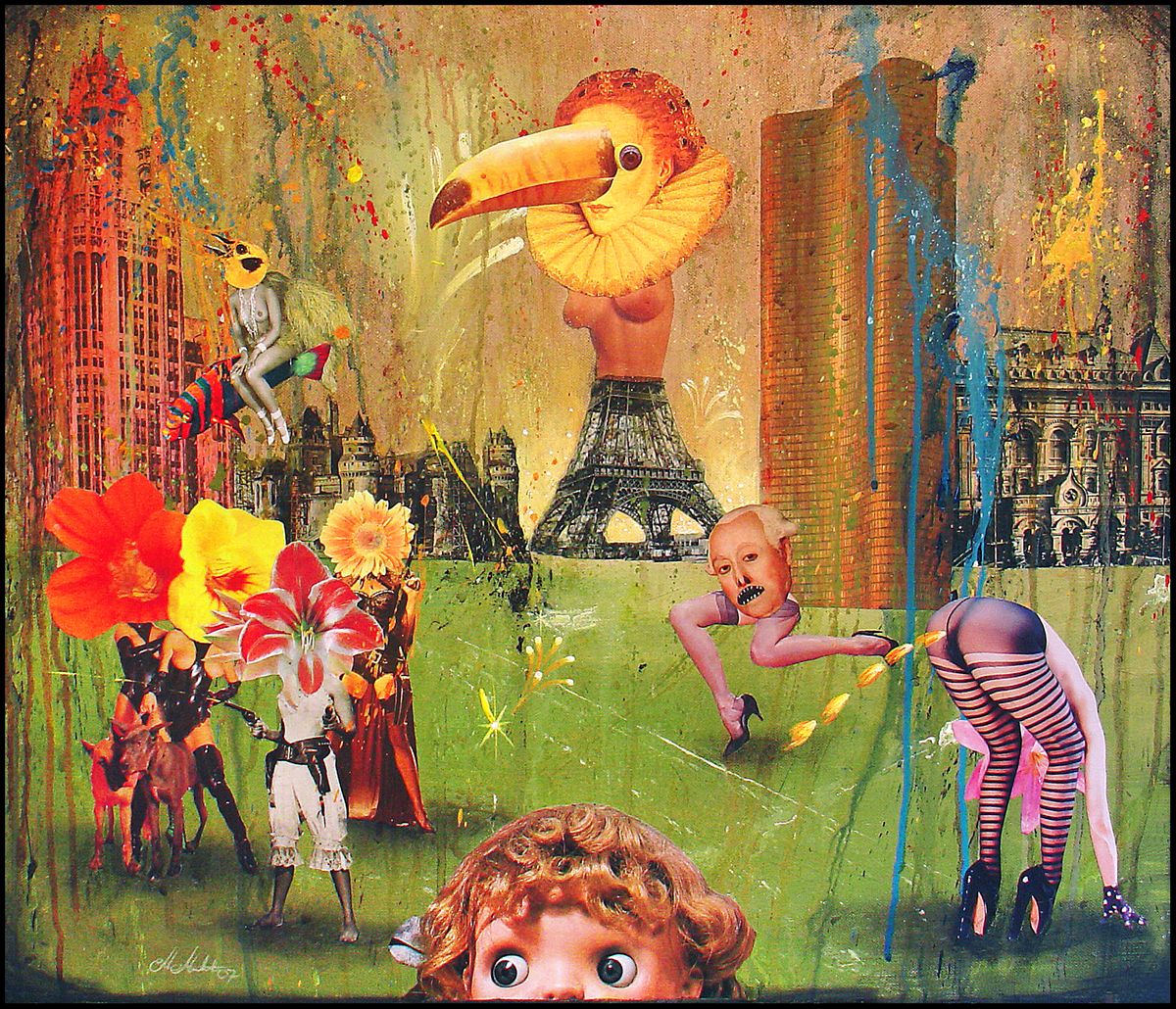 Previous Next Published 2020-08-26 at 1200 × 1030 in DIGITAL COLLAGES BY MIA MAKILA “Carnivale” (2007) acrylic, paper cut-outs and charcoal on canvas. Unavailable.