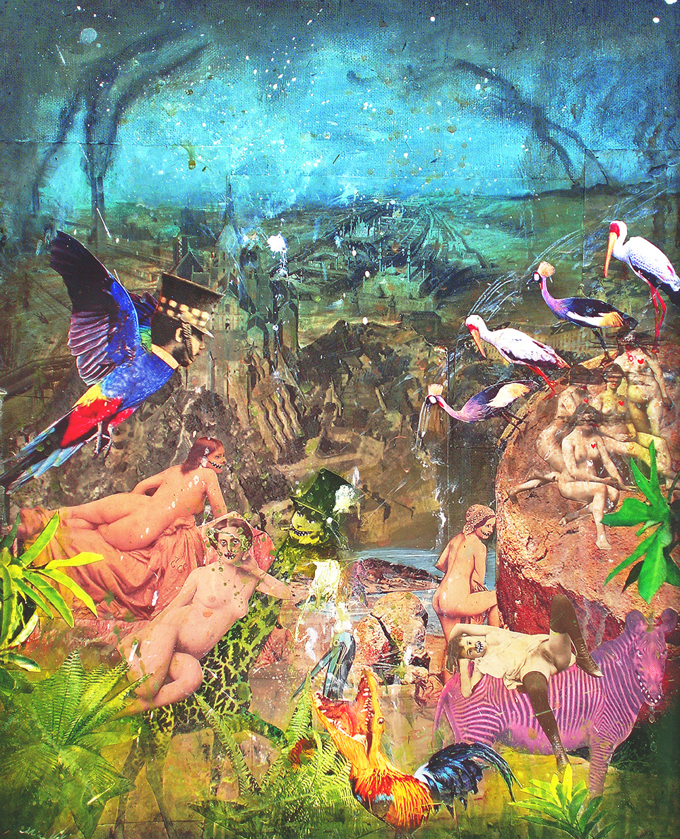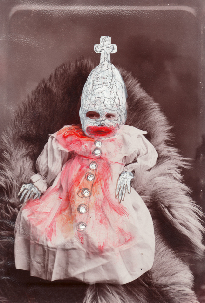 Inspired by early renaissance masters, such as Hieronymus Bosch and Bruegel, mIA Makila’s mixed media collages are highly detailed with a perfect mix of twisted and macabre elements. mAKILA’S mixed media TECHNIQUE INCLUDES acrylic paint, charcoal, paper cut-outs AND ANTIQUE CABINET CARDS.
