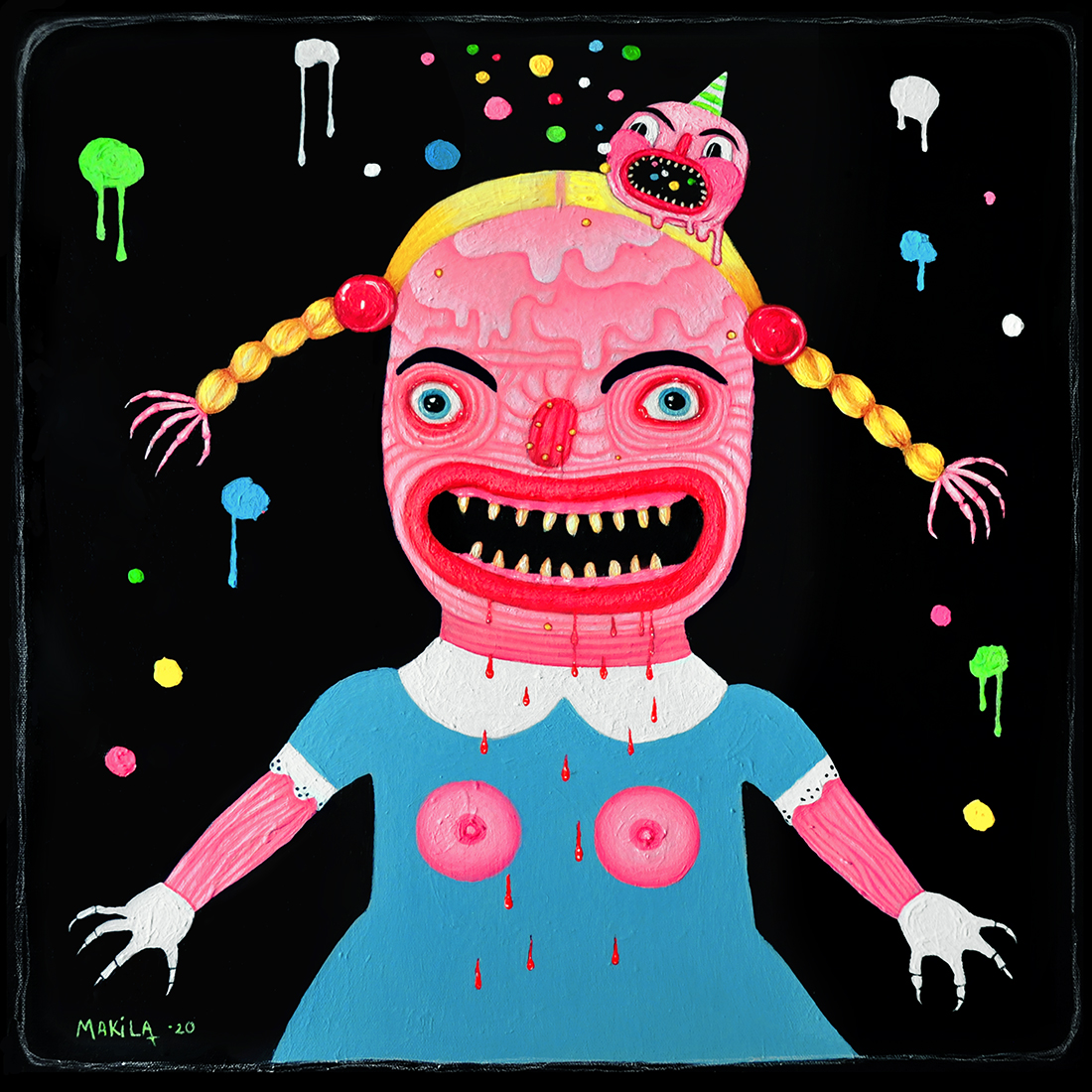 In this gallery, you can explore the colorful paintings of Mia Makila. She uses acrylic paint and tiny brushes, for a detailed and precise look. The inspiration comes from her own demons but also from Pop-surrealism, outsider art, folk art and early renaissance masters. For availability, please Contact the artist.