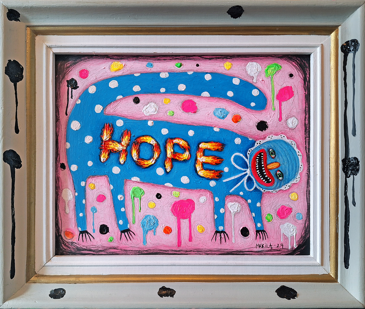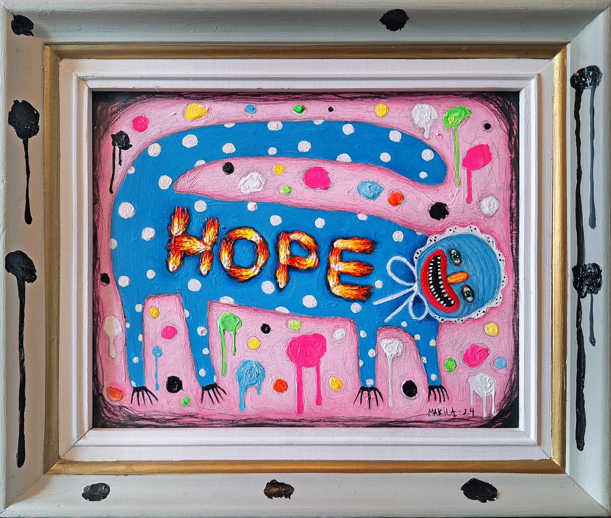 Previous Next Published 2024-03-31 at 1500 × 1272 in PAINTINGS BY MIA MAKILA “A Little Hope” (2024), acrylic, color pencil and charcoal on wood panel. Available.